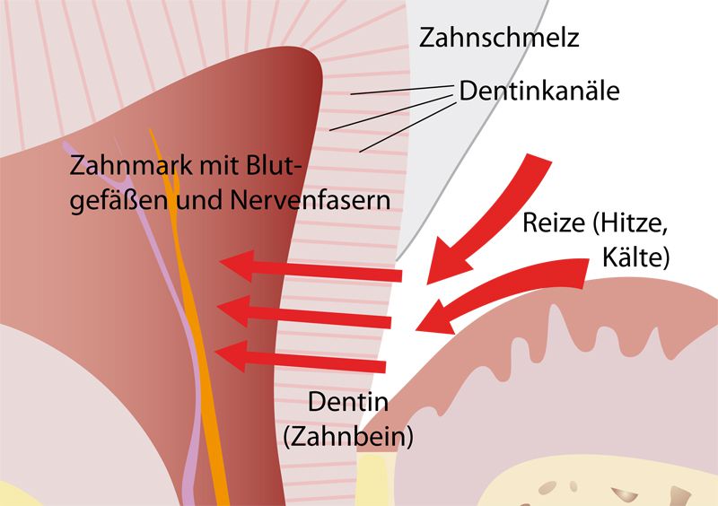 Home Über uns News Schwerpunkte Leistungen Ratgeber Zähne Kontakt Herzlich willkommen Welcome - we look forward to your visit Bienvenue! Nous nous réjouissons de vous voir. Bienvenido! Nos alegramos de su visita. Καλώς ορίσατε!! Ανυπομονούμε να μας επισκεφτείτε! أهلاً و سهلاً, نحن نسعدٌ بكم خوش آمدید Vorsorge Behandlung CMD Empfindliche Zähne Füllungen Implantate Karies Knochenaufbau Parodontitis Weisheitszähne Wurzelkanalbehandlung Wurzelspitzenresektion Zähneknirschen Zahnbettentzündung Zahnersatz Zahnextraktion Zahnfleischentzündung Zahnfleischrückgang Zahnfleischtransplantation Ästhetik Infocenter Mehr Informationen: Kurzinfo Was sind empfindl. Zähne? Ursachen Behandlung Eigene Maßnahmen Vorbeugung FAQs Wie kommt es zu den Schmerzen? Oft sind frei liegende Zahnhälse die Auslöser der Beschwerden: Die Zahnkrone ist von dem harten Zahnschmelz überzogen, äußere Reize wie Wärme und Kälte können ihm nur wenig anhaben, so lange er nicht beschädigt ist. Die Zahnwurzel hingegen ist von dem dünneren und weicheren Zahnzement umgeben – normalerweise kein Problem, da sie ohnehin von Zahnfleisch bedeckt ist. Zwischen Krone und Wurzel – im Bereich des Zahnhalses – gibt es einen schmalen Bereich, der von keiner schützenden Schicht überzogen ist. Unter Zahnschmelz bzw. Zahnzement befindet sich das Zahnbein (Dentin), das die Hauptmasse des Zahnes bildet, und ganz im Inneren das Zahnmark (Pulpa). Das Zahnbein wird von kleinen Dentinkanälen durchzogen, die Ausläufer von schmerzempfindlichen Nervenfasern enthalten. Das eigentliche Nervengewebe sowie Blutgefäße befinden sich im Zahnmark. Wenn das Zahnfleisch im Bereich des Zahnhalses nun zurückweicht, liegt der Zahnzement der Zahnwurzel frei. Schnell kann diese Schicht beschädigt werden und dann äußere Reize nicht mehr „abfangen“. Außerdem können Reize dort, wo keine schützende Schicht vorhanden ist, direkt zum Zahnbein gelangen. Diese Reize gelangen über die Dentinkanälchen zum Zahnmark und lösen dort die bekannten Schmerzen aus. Die Ursache für zurückweichendes Zahnfleisch (fachsprachlich "Zahnfleischrezession", früher auch "Parodontose" genannt) kann eine falsche Putztechnik und eine erbliche Veranlagung sein. Vor allem bei Patienten mittleren Alters oder bei älteren Menschen weicht das Zahnfleisch ohne Entzündung zurück. Auch eine entzündliche Erkrankung des Zahnhalteapparates, eine Parodontitis, kann die Ursache für die Schmerzempfindlichkeit sein. In ihrem Verlauf entstehen so genannte Zahnfleischtaschen, ein schmaler Spalt zwischen Zahn und Zahnfleisch. Diese Entzündung muss behandelt werden, um weitere Schäden an Zähnen und Zahnhalteapparat zu vermeiden. Daher sollten Sie immer in unsere Praxis kommen, wenn Sie unter Zahnschmerzen leiden. Prinzipiell kann hinter einer Überempfindlichkeit der Zähne allerdings auch eine Karies stecken, die schon tief ins Dentin hineinreicht oder eine Entzündung des sehr Schmerz empfindlichen Zahnmarks selbst. Zu einer Überempfindlichkeit kann es auch kommen, wenn der Zahnschmelz der Kauflächen mehr oder weniger abgerieben ist, zum Beispiel durch Zähneknirschen. Manche Menschen verfügen sogar von Natur aus über mehr und größere Dentinkanäle. Dementsprechend sind ihre Zähne auch empfindlicher.